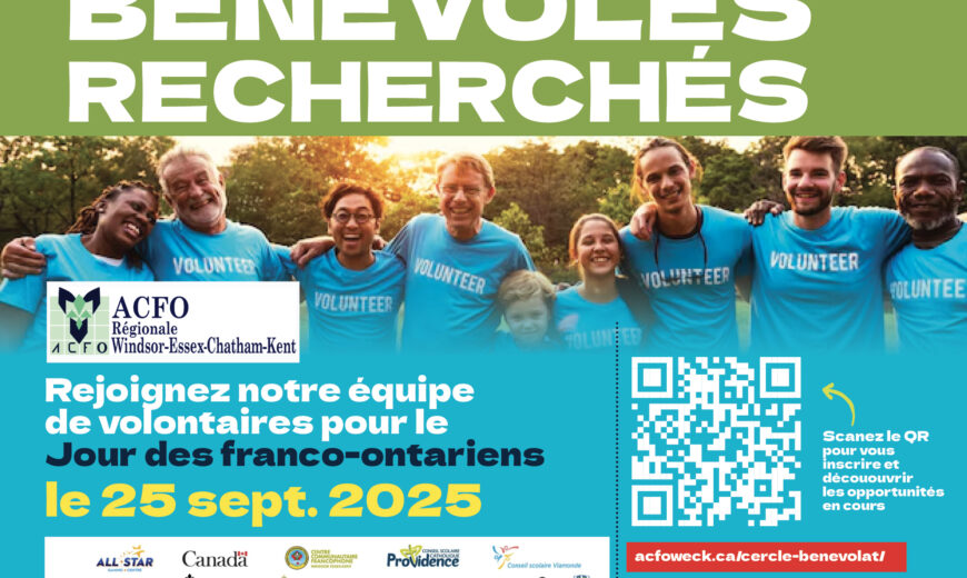 L'ACFO WECK recherche 20 bénévoles pour l'organisation des manifestations du jour des franco ontariens (Lever du drapeau). Organisme: L'Association des communautés francophones de l'Ontario Windsor Essex Kent - ACFO WECK Debut : le 25 septembre 2025 Fin : le 25 septembre 2025 Heure: de 10h à 15h Lieu: Centre ville de Windsor, Ontario. Nombre de…